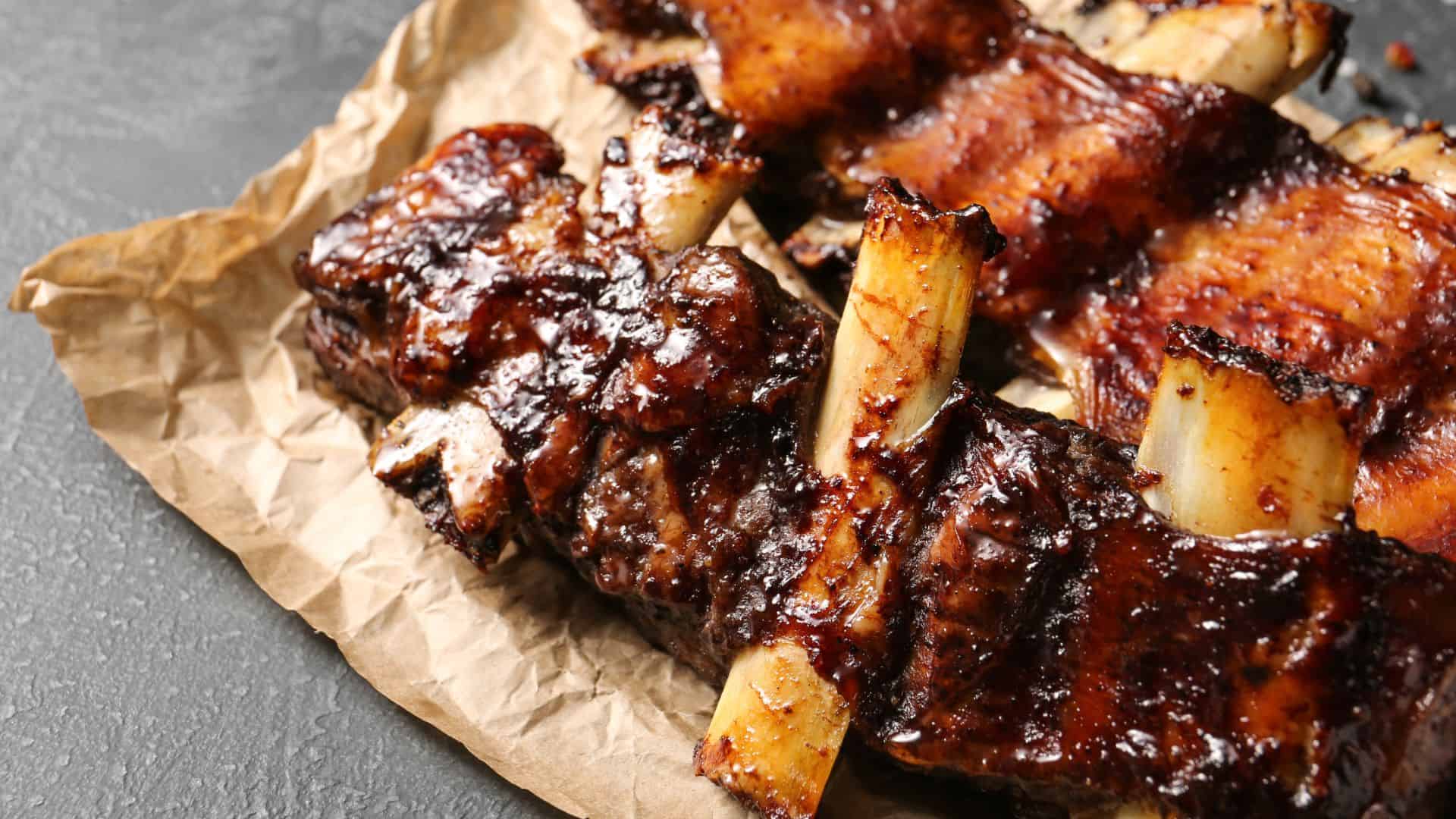Short ribs vind je bij goede slagers, BBQ-specialisten en groothandels zoals Makro en Sligro. Vraag naar “runderribben” of “short ribs” — soms moet de slager ze op maat zagen.